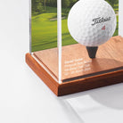 Every display case includes a premium black wooden tee, expertly laser-cut to position your golf ball perfectly within the display. This precise elevation creates a striking tribute to your golfing achievement.